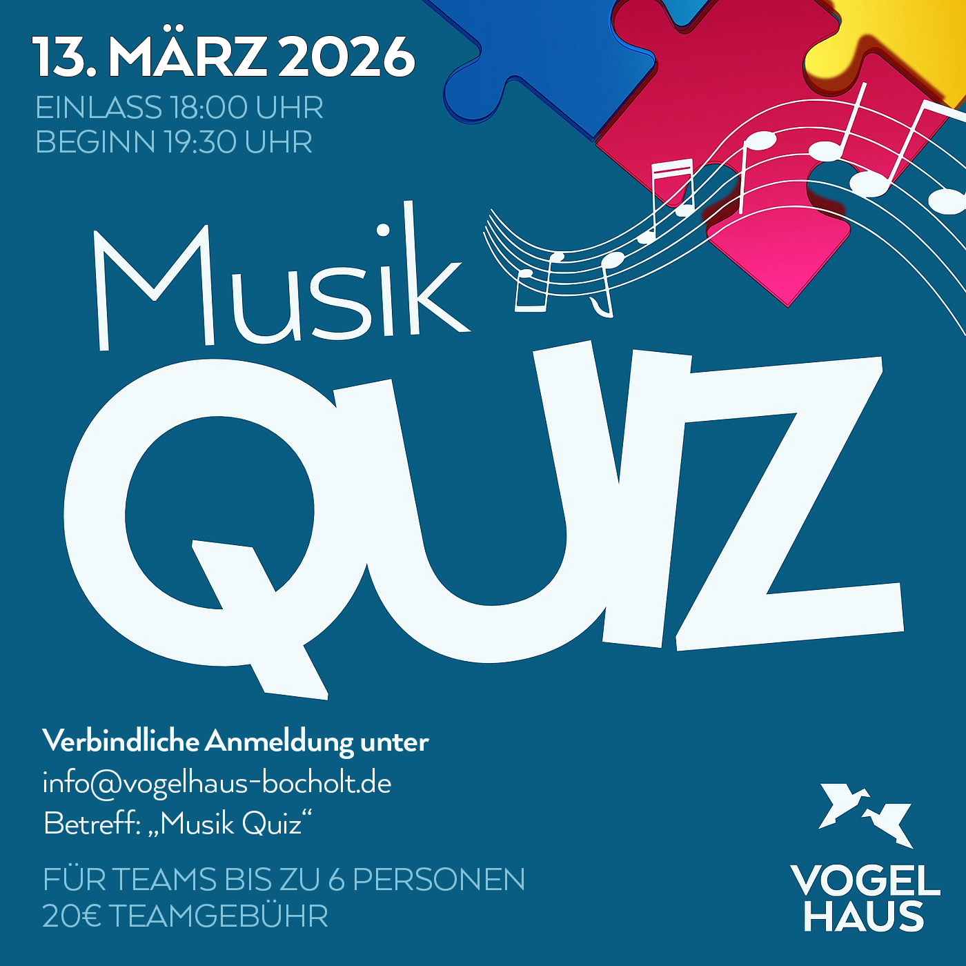 Das grandiose Quiz ist von Bocholtern mit Fragen rund um Musik konzipiert worden. Heiteres Song- und Künstlerraten im Bereich Metal, Hip Hop, Rock, Pop, R&B, Country, Punk und mehr. Ein Spaß für alle die gern Musik hören.